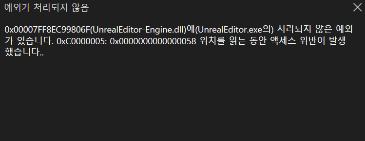 예외 발생(UnrealEditor-Engine.dll): 0xC0000005: 0x0000000000000058 위치를 읽는 동안 액세스 위반이 발생했습니다.