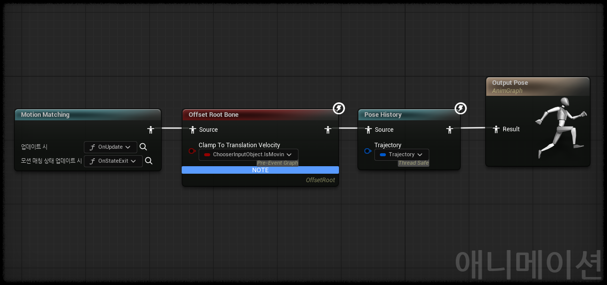 Motion Matching 노드의 Output 핀에서 끌어 Pose History 노드를 연결한다.