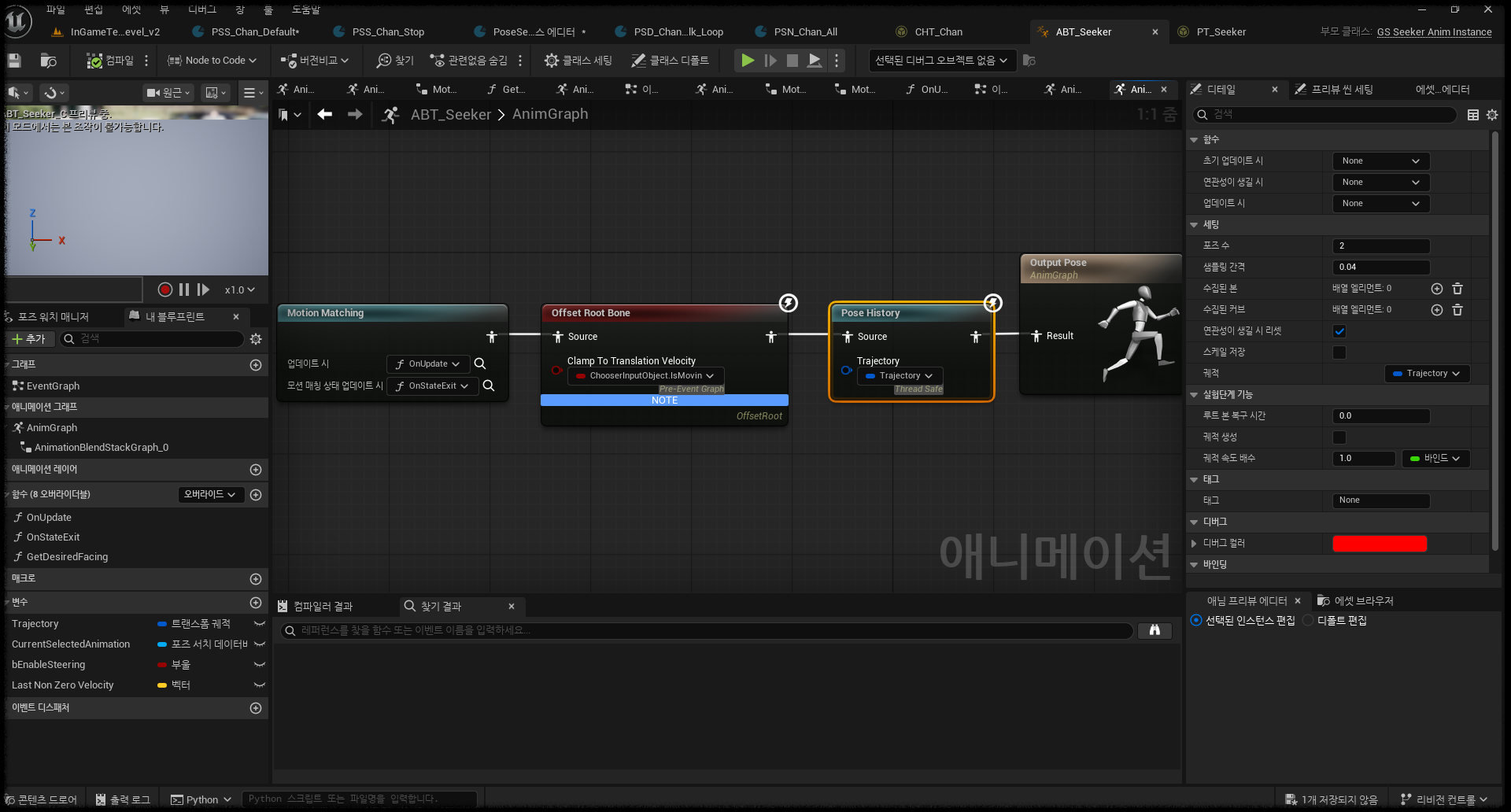 원인: Chooser Table의 속도 조건이 걷기/달리기 경계값에 걸쳐 있고, 캐릭터의 속도가 그 경계를 왔다 갔다 하면 매 프레임 다른 PSD가 선택된다. 여기에 Motion Matching 노드의 Continuing Pose Cost Bias(현재 포즈 유지 편향)가 0에 가까우면, 시스템이 현재 포즈를 고수하려는 관성이 없어서 쉽게 다른 포즈로 넘어간다.