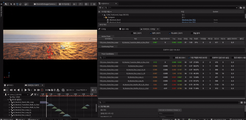 각 채널에는 가중치(Weight)가 있다. “발 위치에 70점 배점, 이동 방향에 30점 배점” 같은 식으로 설계자가 의도적으로 중요도를 조절한다. 이 Weight 설정이 모션 매칭 결과의 품질을 좌우한다.