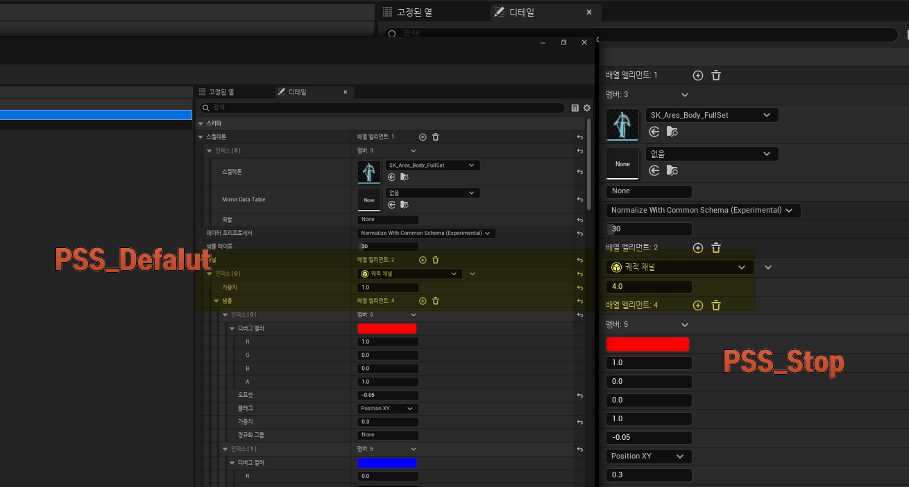 2. 왜 정지(Stop)에서 4.0? - 미끄러짐 방지: 가중치가 낮으면 캐릭터가 멈춰야 함에도 불구하고, 걷기 애니메이션이 선택되어 발이 땅에서 미끄러지는 현상이 발생할 수 있다. 가중치를 4.0으로 높이면 시스템이 정지 궤적에 훨씬 더 민감하게 반응하여 즉시 정지용 애니메이션을 선택하게 만든다. 결론적으로, `PSS_Ares_Stop`에서 가중치를 4.0으로 설정한 것은 정지 명령에 대한 정확도를 극대화하여 캐릭터가 미끄러지지 않고 정확한 지점에 멈추게 하려는 의도다.