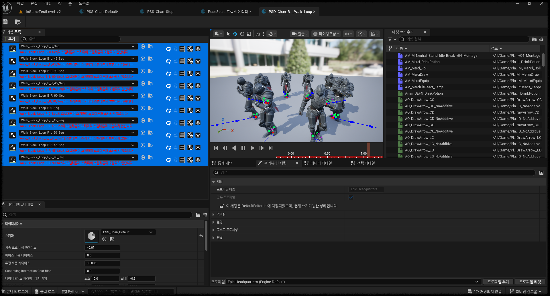 동시에 PSD의 Continuing Pose Cost Bias를 음수로 설정해서, 현재 재생 중인 포즈를 좀 더 오래 유지하도록 관성을 부여한다.