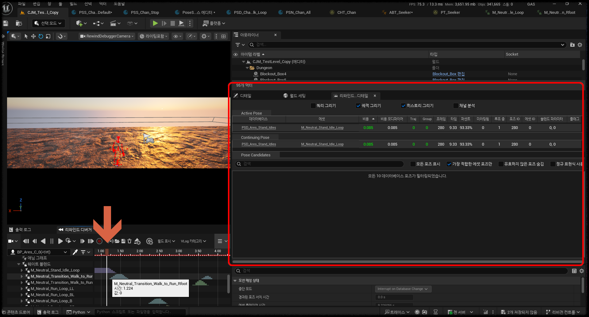 사전 준비: Pose Search 플러그인과 Animation Insights 플러그인을 둘 다 활성화해야 한다. 툴 - 디버그 - 리와인드 디버거