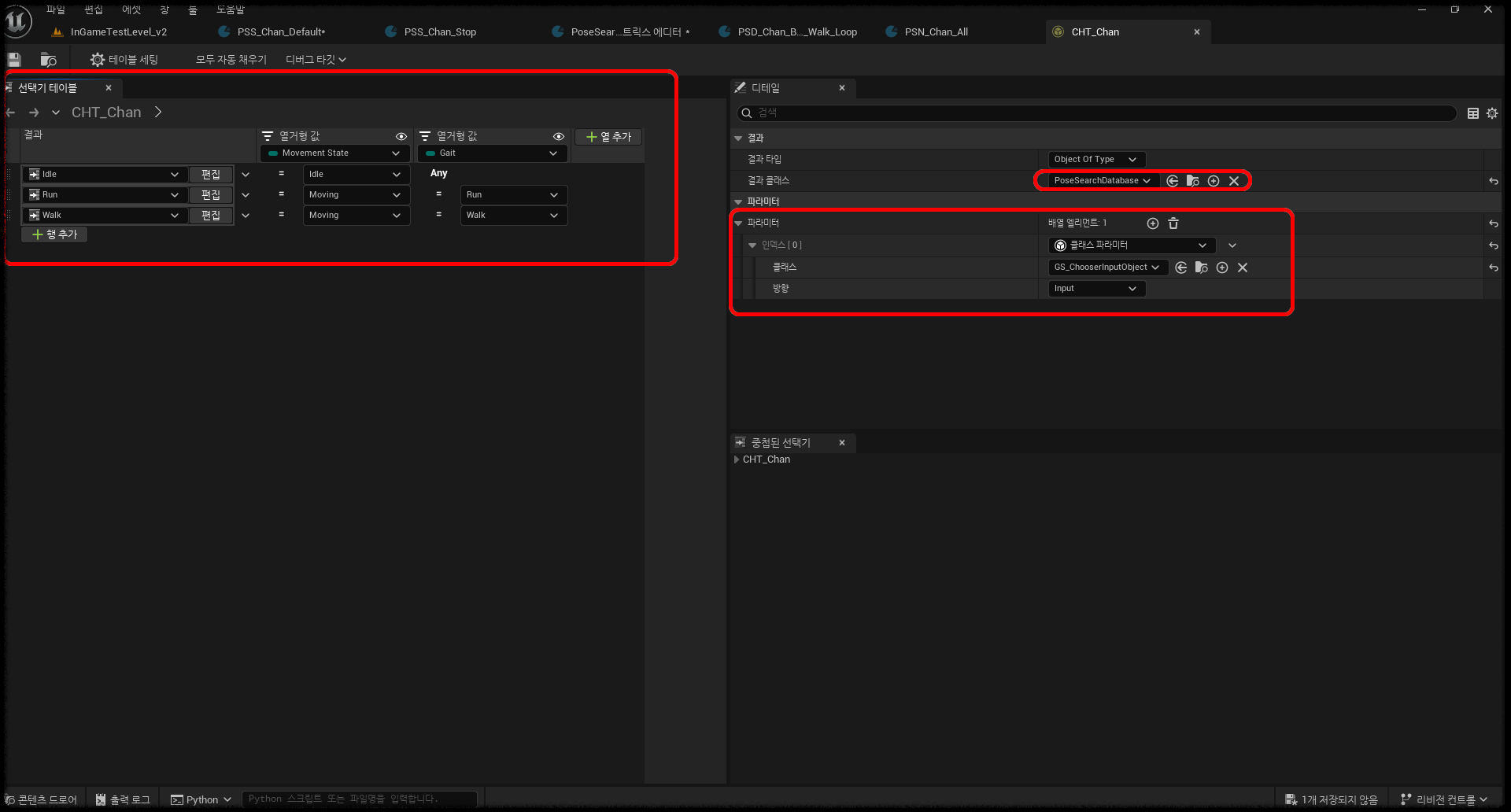 ⚠️ Chooser Table을 쓰려면 Context Data에 어떤 애니메이션 블루프린트의 변수를 읽을지 클래스를 반드시 지정해야 한다. 이 설정이 빠지면 Column에서 변수를 참조할 수 없다.