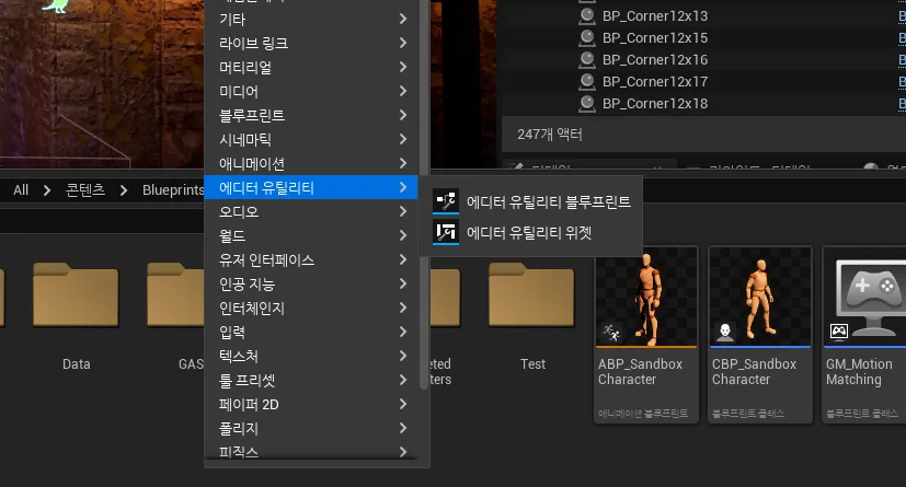 - 콘텐츠 브라우저에서 우클릭 → 에디터 유틸리티(Editor Utilities) → 에디터 유틸리티 위젯(Editor Utility Widget) 선택.