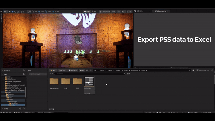 - 별도의 창이 뜬다. 추출할 에셋들을 콘텐츠 브라우저에서 선택한 뒤, 위젯의 “엑셀로 내보내기” 버튼을 누르면 된다.