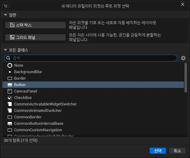 - 루트 위젯 클래스를 선택하는 창이 뜨면 Button을 선택한다. 이름은 EUW_SchemaExporter로 짓는다.