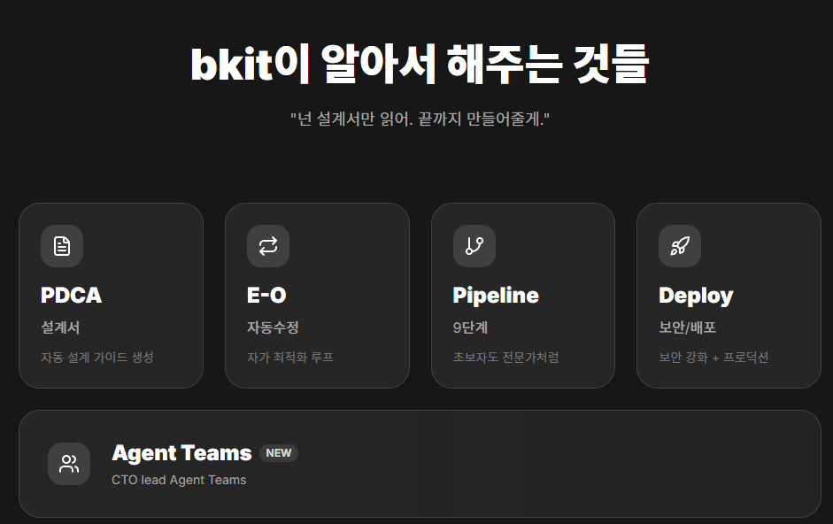 bkit (Bkamp Vibecoding Kit)은 AI와 함께 소프트웨어 개발을 구조화·자동화하는 도구로,